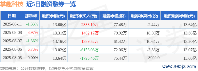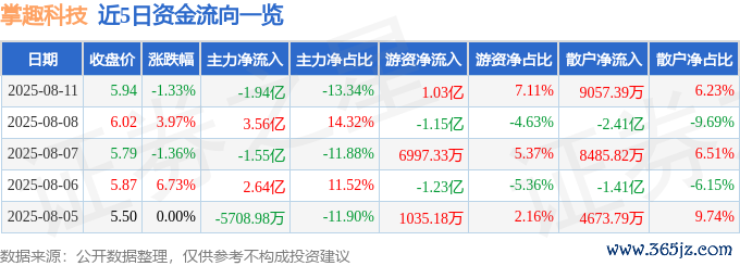 本站音问,逼迫2025年8月11日收盘,掌趣科技(300315)报收于5.94元,下落1.33%,换手率9.51%,成交量245.65万手,成交额14.53亿元。